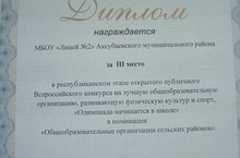 МБОУ "Аксубаевский лицей" наградили за 3 место в республиканском этапе открытого публичного Всероссийского конкурса на лучшую общеобразовательную организацию, развивающую физическую культуру и спорт, "Олимпиада начинается в школе"в номинации "Общеобразовательные организации сельских районов".