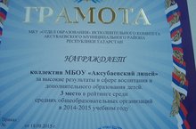 МКУ "Отдел образования" наградил грамотой коллектив МБОУ "Аксубаевский лицей" за высокие результаты в сфере воспитания детей. 3 место в рейтинге среди средних общеобразовательных организаций в 2014-2015 учебном году.