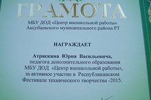 МБУ ДОД "Центр внешкольной работы" наградил грамотой Атряскина Юрия Васильевича, педагога дополнительного образования МБУ ДОД "Центр внешкольной работы", за активное участие В Республиканском Фестивале технического творчества - 2015.