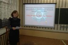 7 мая в школе состоялась интеллектуальная игра среди старшеклассников, посвященная празднованию Дня Победы в Великой Отечественной войне «Мы помним, мы гордимся». Ребята с увлечением проходили тур за туром, вспоминая историю России, узнавая, что-то новое. ЗДВР Калимуллина Е.А. подготовила для ребят интересную познавательную презентацию не только с вопросами, но и с историческими фактами. В конце мероприятия ребята читали стихи о войне, о Победе, о ветеранах. Учащиеся 5-8 классов вместе с педагогом-организатором Головановой Т.А. вспоминали о героях Советского Союза, участвовали в викторине, а ученик 7 класса, член краеведческого кружка Башатов Антон рассказал ребятам о подвиге Героя Советского Союза, нашего земляка Романова Г.Г.