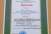 Казан шәһәрендә уздырылга, татар мәгрифәтчесе Ибраһим Хәлфин исемендәге XIII республикакүләм фәнни- гамәли конференциясендә 11 сыйныф укучысы Насыйрова Динә III дәрәҗә диплом белән бүләкләнде.