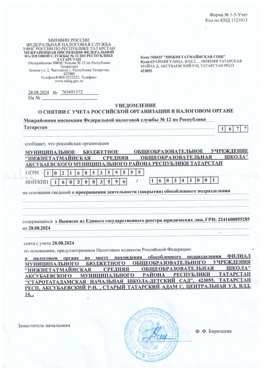 О ликвидации филиала МБОУ НТМ СОШ АМР РТ Старотатадамская НШ Уведомление о снятии с учета организации в налоговом органе
