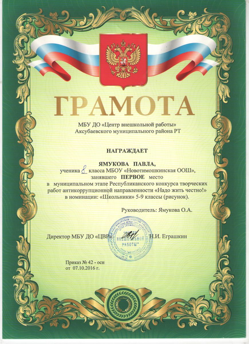 Грамота победителя в конкурсе сочинений "Скажем коррупции "НЕТ!"