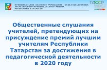 В районе прошли Общественные слушания учителей, которые были выдвинуты педагогическими коллективами общеобразовательных организаций для участия в конкурсе на присуждение премий лучшим учителям Республики Татарстан за достижения в педагогической деятельности в 2020 году.