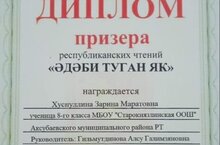 Мәктәп укучылары һәрдаим төрле конкурсларда катнашып торалар. Баланың сәләтен ачу,үстерү -укытучының төп бурычларының берсе.Һәр агачның җимеше була,ә эшнең -нэтиҗәсе. "Әдәби туган як "республика күләм укуларында Хөснуллина Зәринә(8 кл)призер дипломы белән бүләкләнде. Конкурска әзеләүче укытучы: Гыйльметдинова А. Г.Котлыйбыз!!!