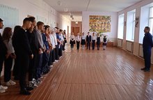 В школе перед тем, как начать разговор о важном в классе, учащиеся собрались в актовом зале учреждения. Первое внеурочное занятие началось с поднятия Государственного флага Российской Федерации и исполнения Гимна России.