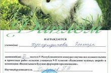 28 ноября ученица 11 класса Хуснутдинова Эльмира приняла участие в V Республиканском конкурсе научно-исследовательских и проектных работ сельских учащихся 9-11 классов и заняла 3 место (руководитель Горбунов Г.В.). Поздравляем!