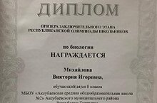 Биология фәне буенча мәктәп укучыларының республика этабы олимпиадасының призеры 8б сыйныф укучысы Михайлова Викторияне, укытучы Панюкова Надежда Николаевнаны котлыйбыз! Киләчәктә дә уңышлар телибез!