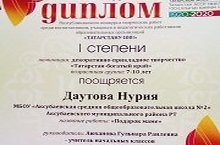 Ученица 3а класса Даутова Нурия награждена дипломом 1 степени в номинации декоративно-прикладное творчество "Татарстан-богатый край" Республиканского конкурса творческих работ среди воспитанников, учащихся и педагогических работников образовательных организаций "Татарстану-100!".