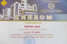 Поздравляем Архипову Дарью, ученицу 4 класса, занявшую третье место в республиканской акции-конкурсе "Помоги первокласснику безопасно прийти в школу" в номинации "Слоганы", руководитель Дружкова Л.А.