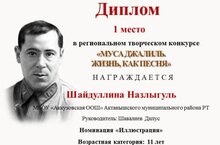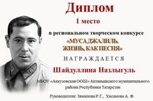 Ученица 6 класса МБОУ «Аккузовская ООШ» Шайдуллина Назлыгуль заняла 1 место на региональном конкурсе «Муса Джалиль. Жизнь, как песня» в номинации «М. Джалиль на татарском языке», проводимом МБУ «Центральная библиотечная система» г. Наб. Челны. Руководители: Зямилова Р.Г., Хисамова А.Ф.. Поздравляем!///