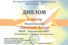 2023 нче елның 7 декабрендә Актанышның балалар иҗат үзәгендә инвалидлар декадасы кысаларында районкүләм 19 нчы мәртәбә үткәрелүче «Өмет торналары» оригами кул эшләре бәйгесендә 3 класс укучысы Салишев Айнур I урын алды. Ул диплом hәм истәлекле бүләккә лаек булды. Җитәкчесе: Гарипова Энҗе Флүн кызы. Котлыйбыз!