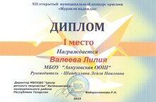2023 нче елның 7 декабрендә Актанышның балалар иҗат үзәгендә инвалидлар декадасы кысаларында районкүләм 19 нчы мәртәбә үткәрелүче «Өмет торналары» оригами кул эшләре бәйгесендә 5 класс укучысы Валеева Лилия I урын алды. Ул диплом hәм истәлекле бүләккә лаек булды. Җитәкчесе: Шәйдуллина Ләйлә Наил кызы. Котлыйбыз!