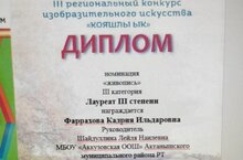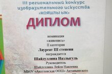 На региональном конкурсе изобразительного искусства «Кояшлы Ык» ученица 5 класса МБОУ «Аккузовская ООШ» Шайдуллина Назлыгуль стала лауреатом III степени в номинации «Живопись». Руководитель Шайдуллина Лейля Наилевна. Поздравляем!///