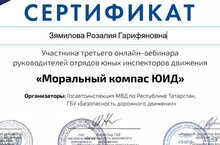 2022 елның 9 декабрендә, РФ Иҗтимагый палатасында яшь хәрәкәт инспекторлары, аларның педагоглары һәм ЮИД хәрәкәтен үстерүдә катнашучылар өчен «Яшь хәрәкәт инспекторлары төркеменең әхлакый компасы» темасына вебинар булды. Чара программасында үсеп килүче буын вәкилләрендә җаваплылык, патриотлык хисе тәрбияләүгә, шулай ук яшь хәрәкәт инспекторларының шәхес сыйфатларын һәм иҗади сәләтләрен үстерүгә юнәлдерелгән дискуссия булды. Вебинарда педагог-оештыручы Җәмилова Р.Г. катнашты.