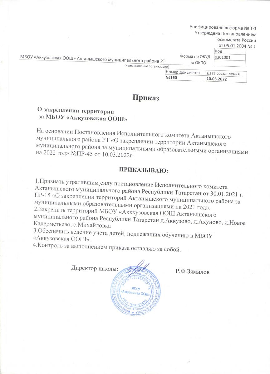 Приказ "О закреплении территории за МБОУ "Аккузовская ООШ" (2022)