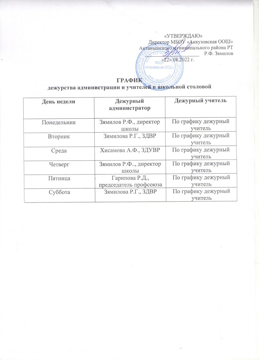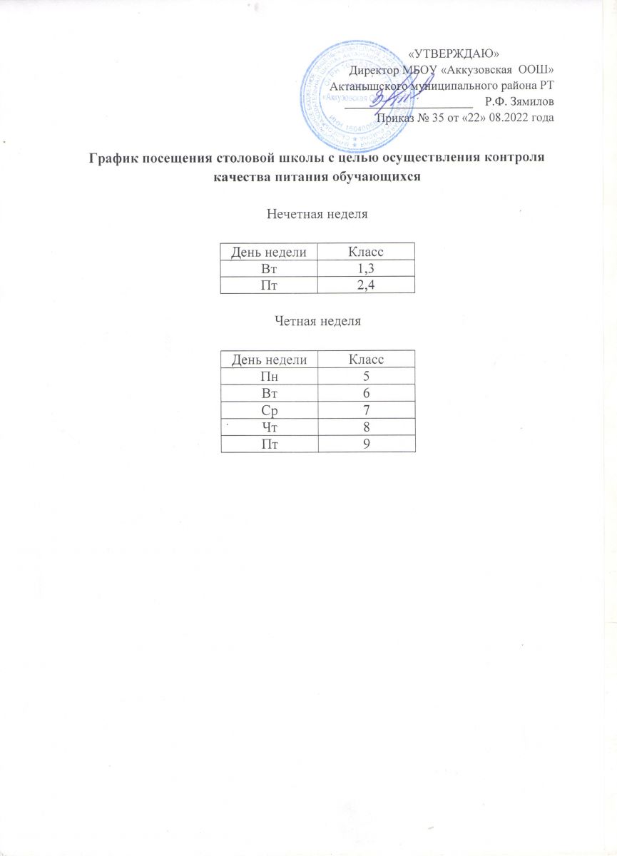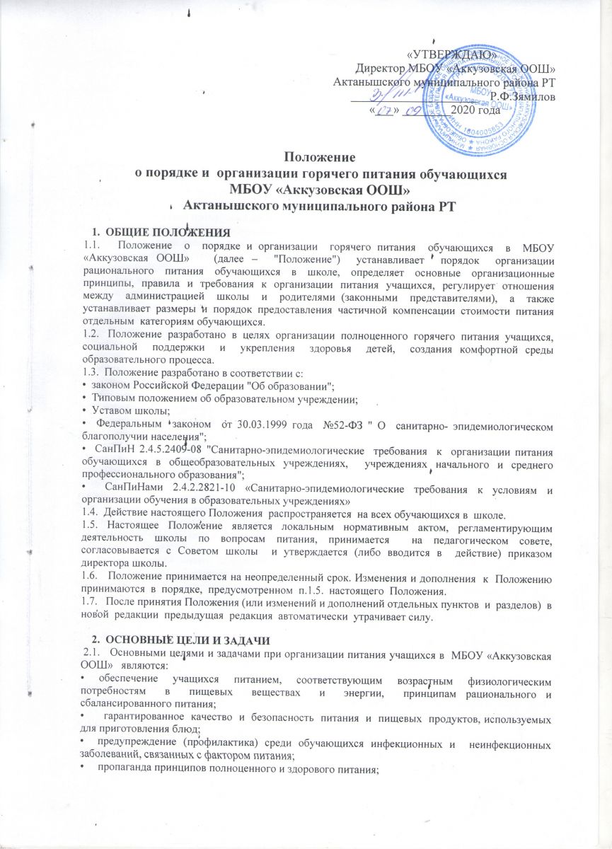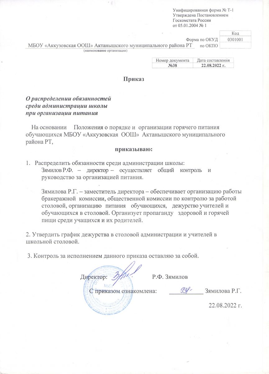 Приказ о распределении обязанностей среди администрации школы при организайии питания