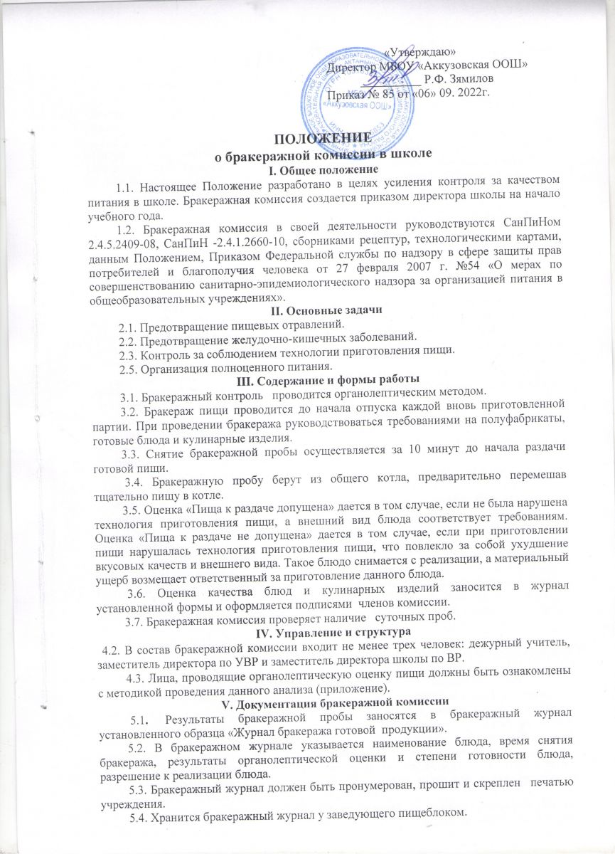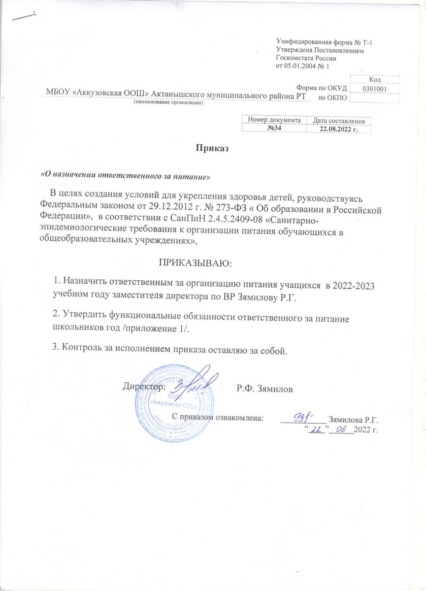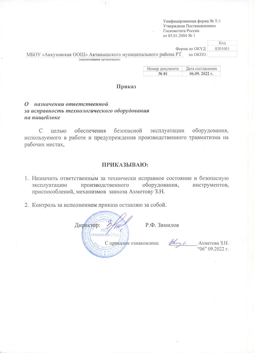 Приказ о назначении ответственной за исправность технологического оборудования на пищеблоке
