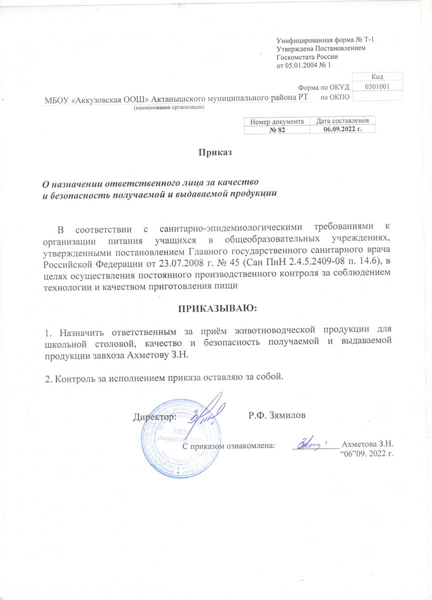 Приказ о назначении ответсвенного лица за качество получаемой и выдаваемой продукции
