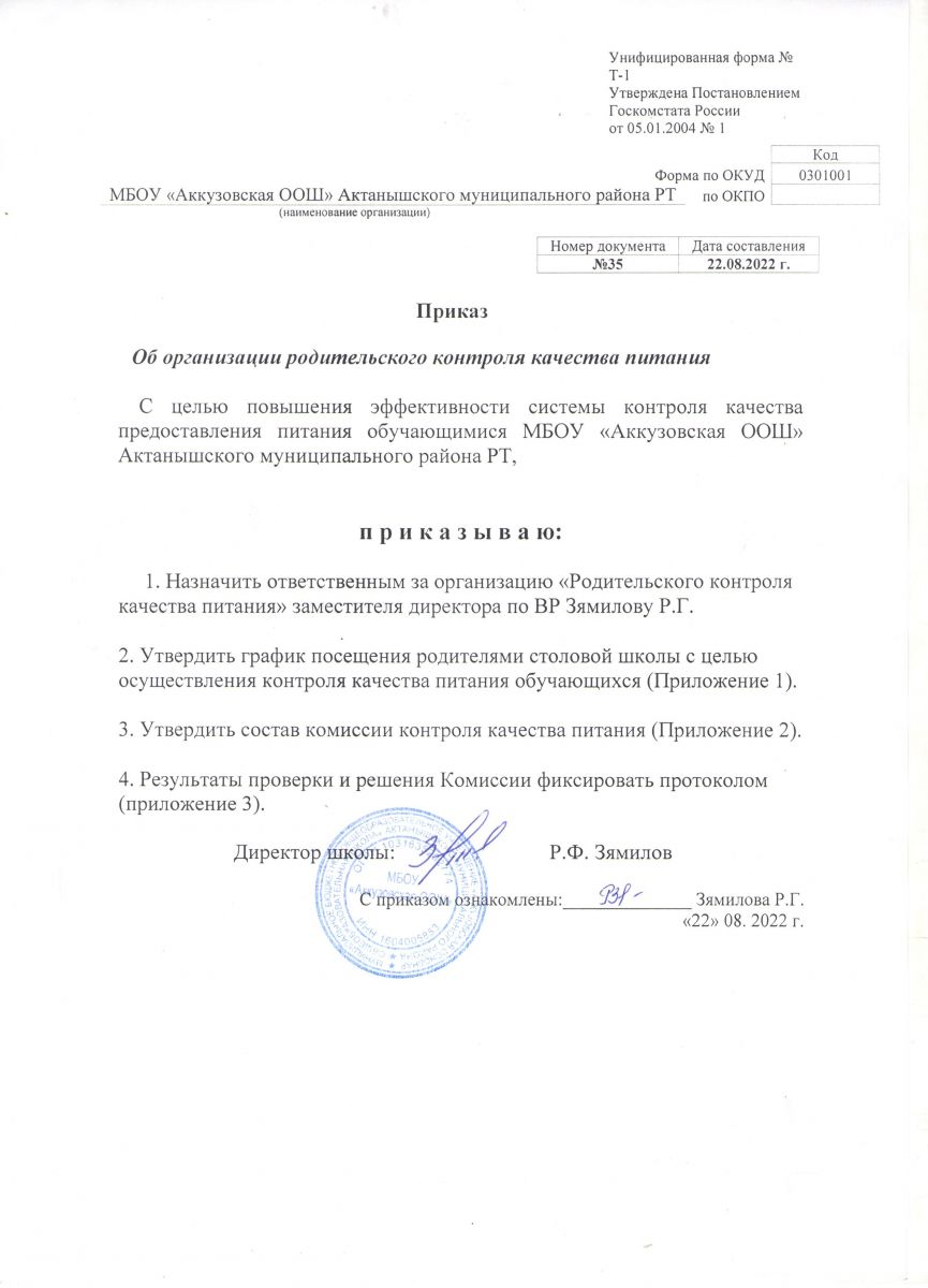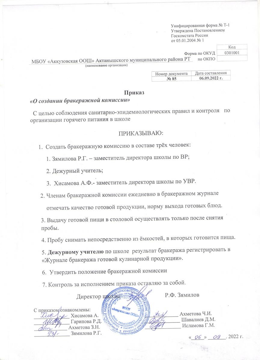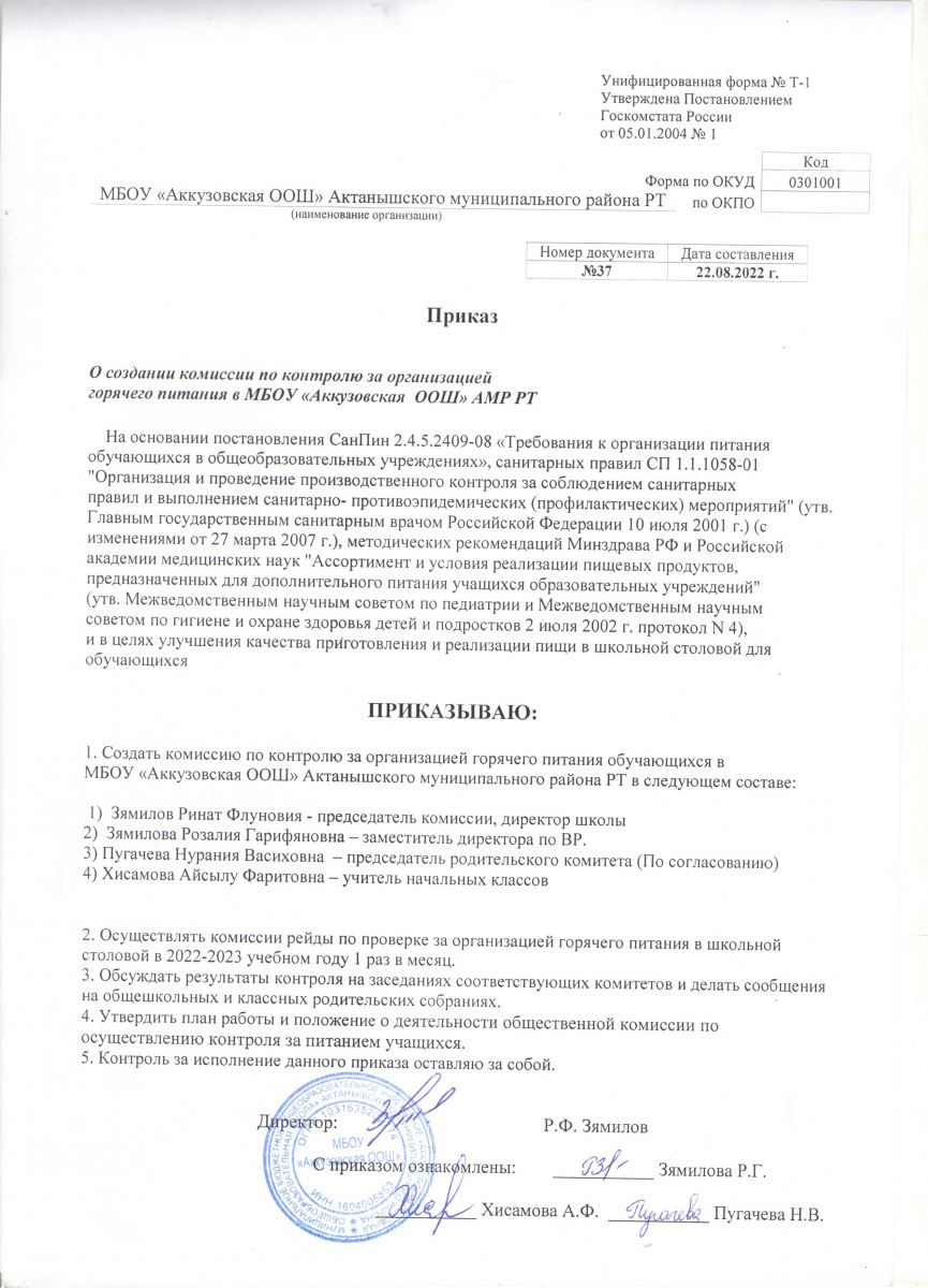 Приказ о создании комиссии по контролю за организацией горячего питания