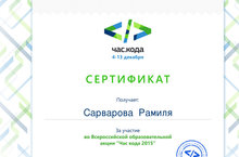 4 нче декабрь Россиядә информатика көне буларак билгеләп үтелә. Шул уңайдан безнең мәктәп укучылары “Всемирный Час Кода” акциясендә катнашып, сертификатка ия булдылар.