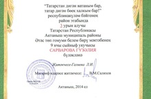 "Татарстан дигән ватаным бар, татар дигән бөек халкым бар" республикакүләм презентацияләр бәйгесе нәтиҗәсе буенча 9 нчы сыйныф укучысы Сарварова Гүзәлия (җитәкчесе - Галиева Л.И.) 3 нче урынны яулады. Афәрин!
