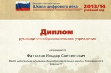 "Школа цифрового века" исемле Бөтенроссия проектында катнашканы өчен мәктәбебез һәм проект кысаларында мәктәпне цифрлы методик материаллар белән тәэмин итүдә уңышлы эшләгәне, педагогик коллективка эшләү өчен яхшы җирлек тудырганы өчен мәктәп директорыбыз Илдар Сәетҗанович диплом белән бүләкләнде.