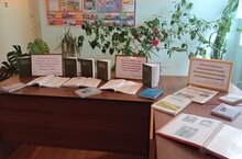 Мәктәптә М.Мирза иҗатына багышланган китаплардан күргәзмә эшли./ В школе работает выставка книг, посвященная творчеству М. Мирзы.