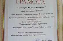 “Кулларыма каләм алам...” зонокүләм иҗади бәйгедә “Яшь прозаик” номинациясендә 3 нче класс укучысы Гөлназ Мөхәммәтова I урын алды. Котлыйбыз! Укытучысы - Ч.Р.Шәвәлиева.