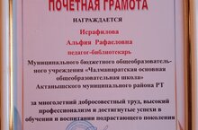 Педагог-библиотекарь - Әлфия Рафаил кызы Исрафилова - күпьеллык намуслы хезмәте, югары профессионализм һәм үсеп килүче буынны укытуда һәм тәрбияләүдә ирешелгән уңышлары өчен Татарстан Республикасы Актаныш муниципаль районы башкарма комитеты МКУ “Мәгариф идарәсе”нең Мактау кәгазе белән бүләкләнде. Котлыйбыз! Киләчәктә дә уңышлар телибез./ Педагог-библиотекарь Альфия Рафаиловна Исрафилова награждена Почётной грамотой МКУ "Управление образования" Исполнительного комитета Актанышского муниципального района РТ за многолетний добросовестный труд, высокий профессионализм и достигнутые успехи в обучении и воспитании подрастающего поколения. Поздравляем! Желаем дальнейших успехов.