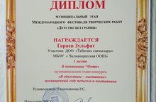 В муниципальном этапе конкурса Международного фестиваля творческих работ «Детство без границ» в номинации «Фото» «В объективе - наставник» посвящённый году педагога и наставника ученик VIII класса З.Д.Гараев занял I место. Поздравляем! Руководитель: Галимзянова Р.С..