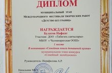 В муниципальном этапе конкурса Международного фестиваля творческих работ «Детство без границ» в номинации «Семейная книга домашней кухни» «Семейный калейдоскоп» ученик VIII класса Н.Ш.Булатов занял I место. Поздравляем! Руководитель: Исрафилова А.Р..