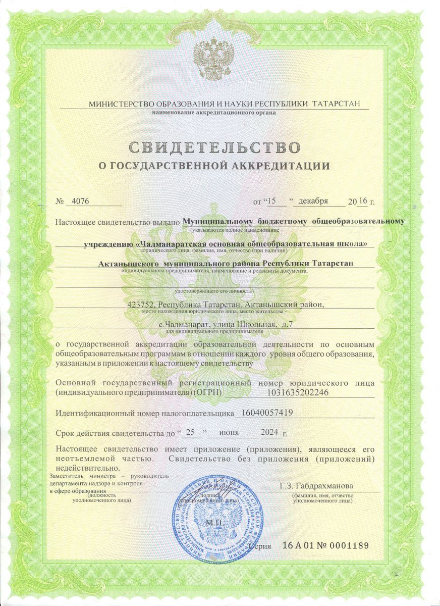 - Полное /сокращенное наименование образовательной организации / Муниципальное бюджетное общеобразовательное учреждение "Чалманаратская основная общеобразовательная школа" Актанышского муниципального района Республики Татарстан/Татарстан Республикасы Актаныш муниципаль районы "Чалманарат төп гомуми белем бирү мәктәбе" гомуми белем бирү муниципаль бюджет учреждениесе / МБОУ "Чалманаратская ООШ"/