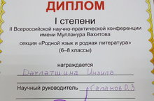 Чаллы шәһәрендә узган Мулланур Вахитов исемендәге II Бөтенрәсәй фәнни-гамәли конференциядә 7 сыйныф укучысы Давлетшина Инзилә 1 урынга ия булып, диплом белән бүләкләнде. Укытучысы Салахов Р.З.