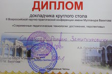 Чаллы шәһәрендә узган Мулланур Вахитов исемендәге II Бөтенрәсәй фәнни-гамәли конференциядә түгәрәк өстәл янында мәктәбебез директоры Салахов Рамил Җәмигънур улы "Мәгарифтәге проблемалар, аларны чишү юллары" дигән темага чыгыш ясап, диплом белән бүләкләнде.