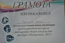 1. Булатова Риана (1 кечкенәләр төркеме) "Кросс-Татарстана -2017" бәйгесендә катнашты, грамота белән бүләкләнде. Аңа киләчәктә дә уңышлар телибез.