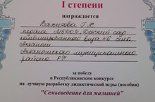 Авторская игра воспитателя Вахитовой Г.Х. заняла 1 место на республиканском конкурсе на лучшую разработку дидактической игры «Семьеведение для малышей» в номинации «Лучшая словесная игра».