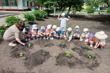 Сегодня дети средней группы вместе с воспитателями посадили в саду помидоры, перцы, огурцы, полили их водой.