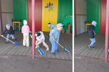 Ребята из средней группы присоединились к акции"Мир. Труд. Май". Они подметали веранду и убрались участке. -