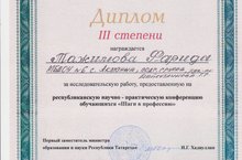 Воспитанница МБДОУ “Детский сад №6” Тажимова Фарида (воспитатель Шайхутдинова Г.Р.) участвовала в республиканской научно-практической конференции и заняла 3 место в номинации “Моя будущая профессия”.
