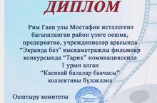Рим Гаян улы Мостафин истәлегенә багышланган район үзәге оешма, предприятие, учреждениеләр арасында "Экранда без" кыскаметражлы фильмнар конкурсында "Тарих" номинациясендә безнең "КАЕНКАЙ" балалар бакчасы I урынга лаек булды.