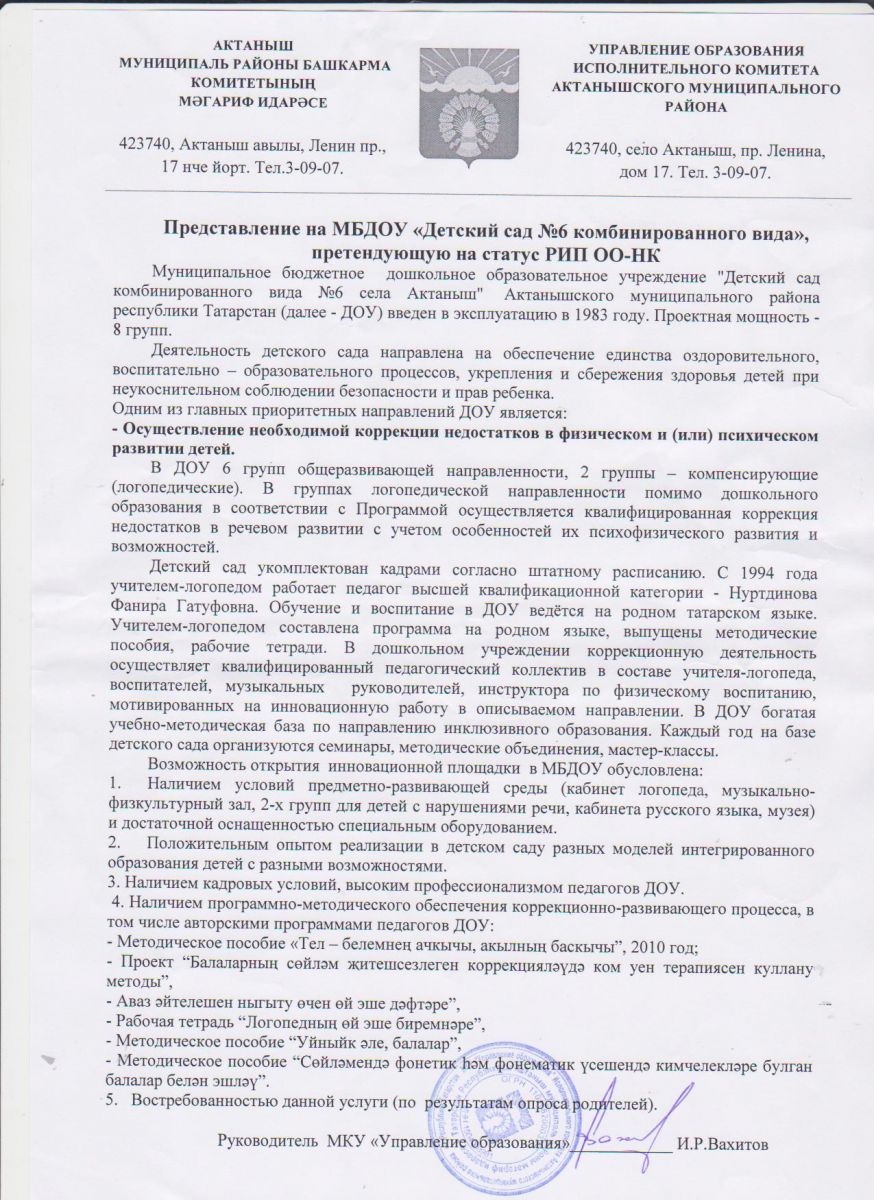 Муниципальное бюджетное дошкольное образовательное учреждение «Детский сад комбинированного вида №6 села Актаныш» Актанышского муниципального района Республики Татарстан/Татарстан Республикасы Актаныш муниципаль районы бюджет мәктәпкәчә белем бирү учреждениесе "Актаныш катнаш төрдәге 6 нчы балалар бакчасы"