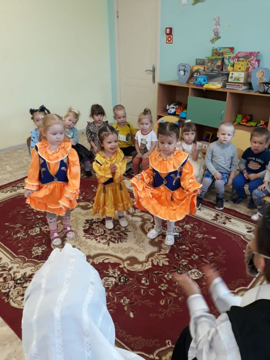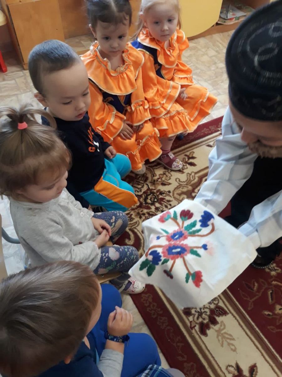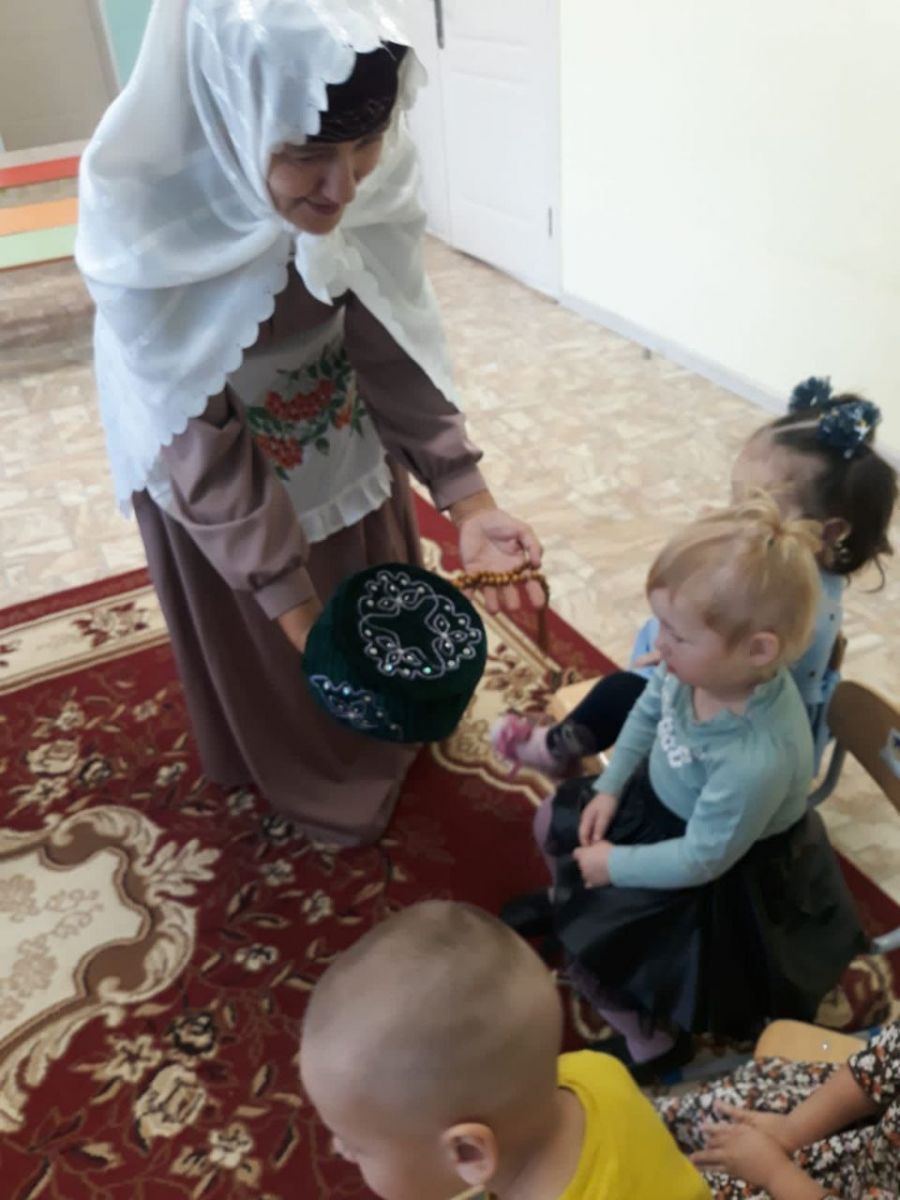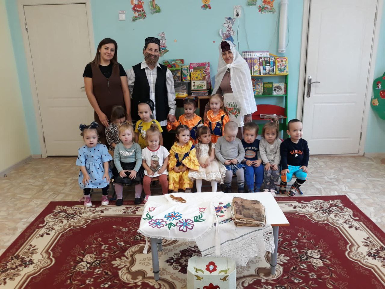 Сегодня в 1-ю младшую группу, в честь дня пожилых людей, в гости пришли бабушка и дедушка. Они с собой принесли сундук, который является достоянием нашей нации. Познакомили детей с наследием татарского народа. Дети с интересом наблюдали. В знак благодарности подарили им свой танец.