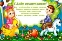 Уважаемые и дорогие коллеги, поздравляем Вас с профессиональным праздником — с Днём Воспитателя и всех дошкольных работников. Примите искренние поздравления и пожелания доброго здоровья и благополучия, уважения и понимания, радостного настроения и смышлёных деток, послушания и весёлых забав, высоких успехов и замечательного настроения.