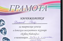 Воспитанник подготовительной к школе группы Хасанов Раяз принял участие в детском шахматном турнире "Кубок Надежды" и был награжден Грамотой за творческие успехи в номинации "Мальчики 2010 года рождения и моложе".