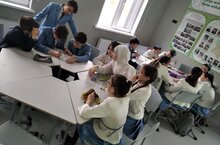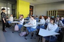 Әлеге фотода 7А сыйныфы укучылары класс җитәкчесе Алсу Рәскать кызы Хәррасова белән дәрес вакытында. -