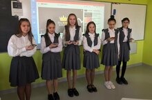 Әлеге фотода 6А сыйныфы укучылары класс җитәкчесе Энҗе Фирдәвес кызы Шәгъзамова белән дәрес вакытында. -