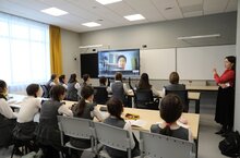 Гимназиябезнең рус теле һәм әдәбияте укытучысы Энҗе Фирдәвис кызы Шәгъзамова 7-10 сыйныф укучылары белән КФУның педагогика фәннәре кандидаты, доцент Елена Ильдар кызы Әюпованың онлайн дәресендә - рус теленнән олимпиадага әзерлек.