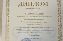 Обучающий 10 класса Шакирова Малика награждается дипломом за оригинальную работу и активные участие на XXXI Поволжской научной экологической конференции школьников им. А.М. Терентьева в номинации "Агроэкология". Руководитель Магданурова Г.Х.