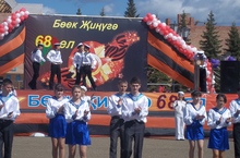 9 май көнне Актанышта Җиңү көненә багышланган театральләштерелгән тамашада мәктәп укучылары моряк биюе белән катнашты.